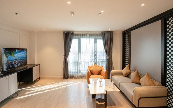 Phòng Grand Suite có không gian rộng rãi, tiện nghi. Gồm 1 phòng ngủ và 1 phòng khách, bàn ăn và gian bếp nhỏ. Từ căn phòng này, bạn sẽ được chiêm ngưỡng vẻ đẹp cổ kính và của nhà thờ Tam tòa.